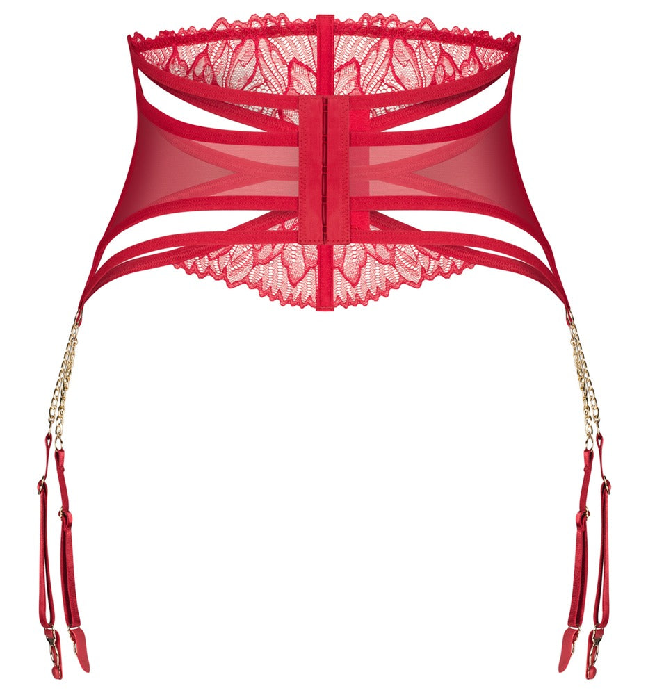 Matildea jarretelgordel van Obsessive in dieprood met transparante mesh tule, fijn kant en goudkleurige kettingen als jarretelverbindingen. Verticale staafjes voor een perfecte pasvorm. Met verstelbare haaksluiting aan de achterkant. De 4 jarretelbanden kunnen ook op maat worden versteld.