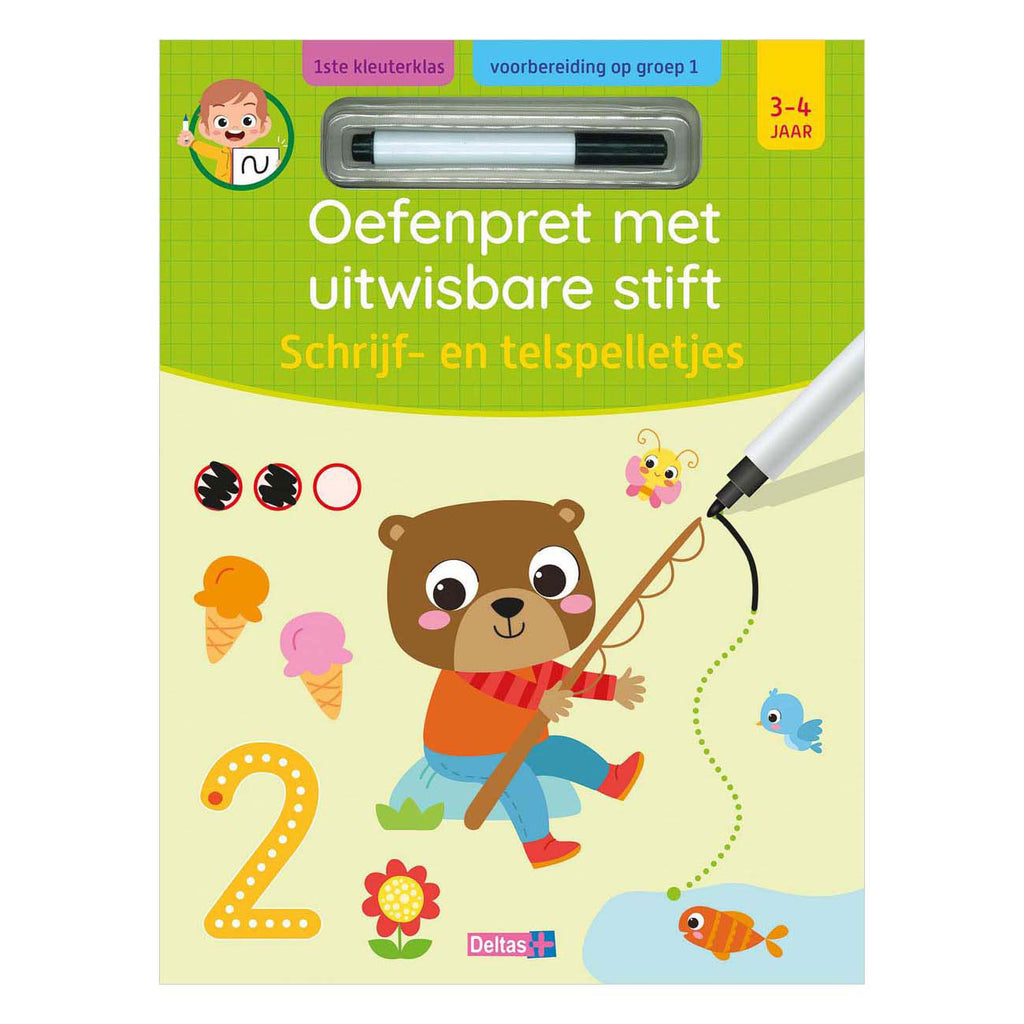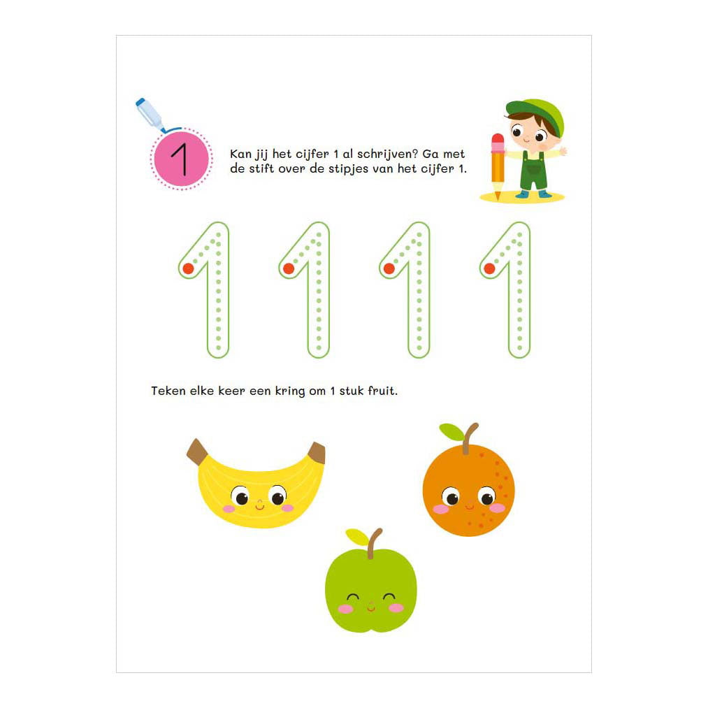 Met dit kleurrijke, uitwisbare oefenboek kan je kind naar hartenlust leren tellen en schrijven. Het bevat een heleboel leuke activiteiten om de schrijfvaardigheid te oefenen en de fijne motoriek te stimuleren. Bovendien staan er eenvoudige teloefeningen in om de cijfers en hoeveelheden tot 5 te leren kennen. Dankzij de uitwisbare stift kan je kind de pagina schoonvegen en de oefeningen steeds opnieuw maken.