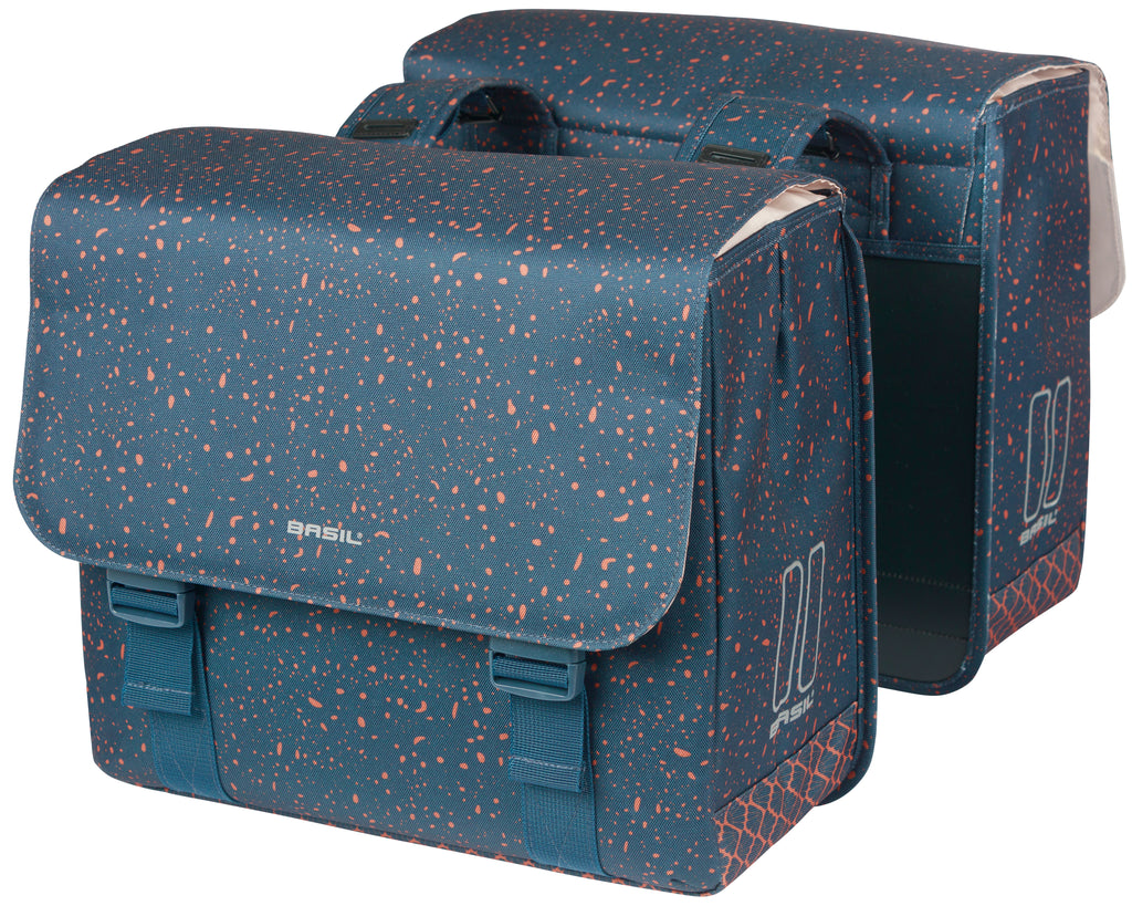 De Basil Flair is de ideale fietstas voor al je dagelijkse ritten en avonturen. Of je nu naar je werk fietst of een dagje weg gaat, deze stijlvolle dubbele fietstas biedt volop ruimte en gemak. Duurzaam & Waterafstotend Gemaakt van sterk, gerecycled polyester met een waterafstotende afwerking, beschermt de Basil Flair je spullen tegen een onverwachte regenbui. De stevige binnenvoering en het aansnoerkoord houden je bagage netjes en veilig op zijn plaats. Stijlvol & Praktisch Met een ruime inhoud van 35 liter heb je voldoende plek voor boodschappen, werkspullen of extra kleding. De tas is uitgevoerd in een tijdloze donkerblauwe kleur met een speelse jaren 70-print, waardoor hij niet alleen functioneel, maar ook een echte blikvanger is. Veilig & Veelzijdig Dankzij de reflectie op alle zijden ben je beter zichtbaar in het verkeer, wat bijdraagt aan je veiligheid. Bovendien is de Basil Flair eenvoudig te bevestigen met het Universal Bridge system, geschikt voor de meeste bagagedragers, inclusief e-bikes. Wil je extra gebruiksgemak? De tas is compatibel met MIK en Racktime platen (apart verkrijgbaar), zodat je hem in één klik op je fiets plaatst. Kenmerken: 35 liter inhoud - ideaal voor boodschappen of dagelijkse benodigdheden. Gerecycled polyester - stevig, waterafstotend en milieuvriendelijk. Veilige opbergruimte - dankzij de stevige binnenvoering en het aansnoerkoord. Betere zichtbaarheid - reflecterende details op alle zijden. Universele bevestiging - geschikt voor diverse bagagedragers en e-bikes. Compatibel met MIK en Racktime - eenvoudig te monteren (platen apart verkrijgbaar). Ga stijlvol en praktisch op pad met de Basil Flair dubbele fietstas!
