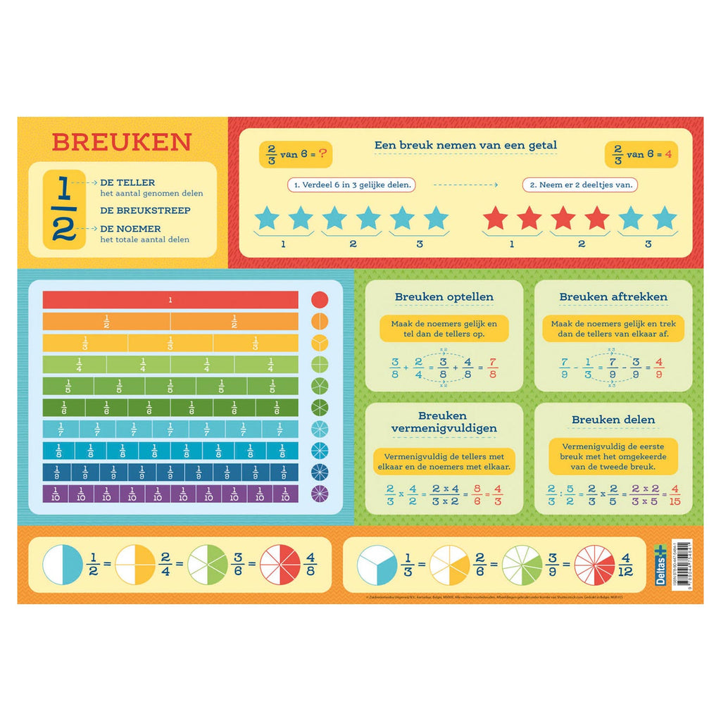 Met deze onderlegger leer je op een speelse manier de basis van breuken. Aan de hand van kleuren en een eenvoudige visuele voorstelling krijg je inzicht in hoe breuken zich tot elkaar verhouden. Hoe moet je breuken optellen en aftrekken? Hoe vermenigvuldig of deel je breuken? Dankzij deze onderlegger hebben breuken geen geheimen meer voor jou! Een vrolijk design in frisse kleuren. Makkelijk schoon te maken met een vochtige doek. Geschikt voor contact met voedingswaren.