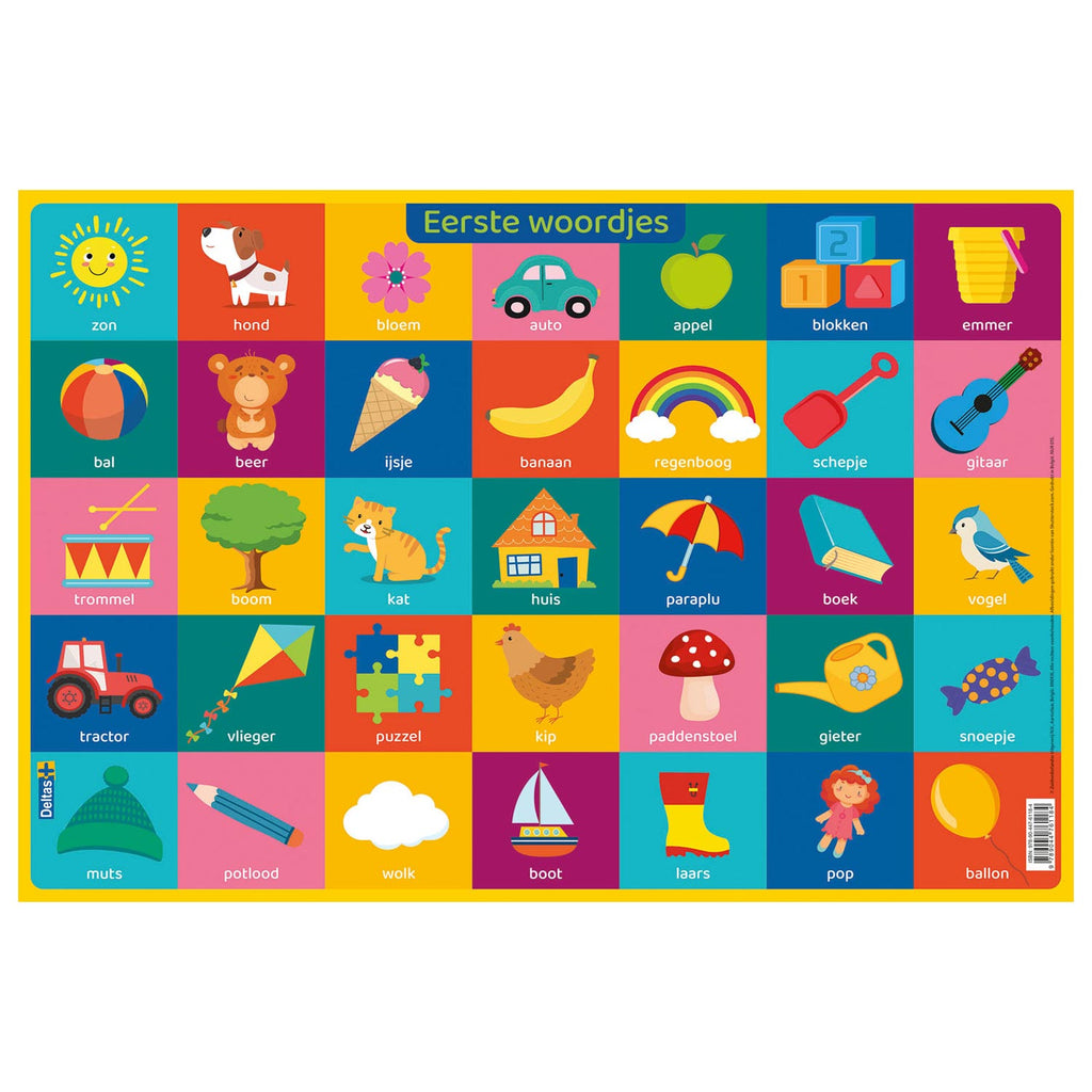 Met deze onderlegger vol kleurrijke illustraties en woorden maken kleuters kennis met heel wat woorden: paddenstoel, auto, kat, puzzel, Zo leert je kind op een speelse manier nieuwe woordenschat. Makkelijk schoon te maken met een vochtige doek en geschikt voor contact met voedingswaren.