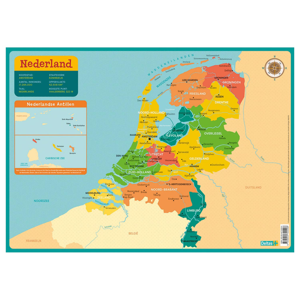 Deze kleurrijke onderlegger met de kaart van Nederland is ideaal als ondersteuning bij de lessen aardrijkskunde. Bij elke provincie staan de hoofdsteden en de belangrijkste plaatsen vermeld. Bovendien krijg je een overzicht van de Nederlandse Antillen en een beknopte informatiefiche. Een vrolijk design in frisse kleuren. Makkelijk schoon te maken met een vochtige doek. Geschikt voor contact met voedingswaren.