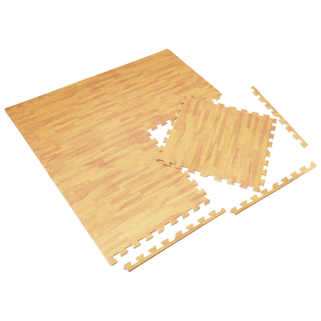 Foamtegels met lichte hout print. De tegels hebben een puzzelsysteem en vormen een zachte ondergrond. In de verpakking zitten vier tegels. De tegels hebben een afmeting van 60 bij 60 centimeter.