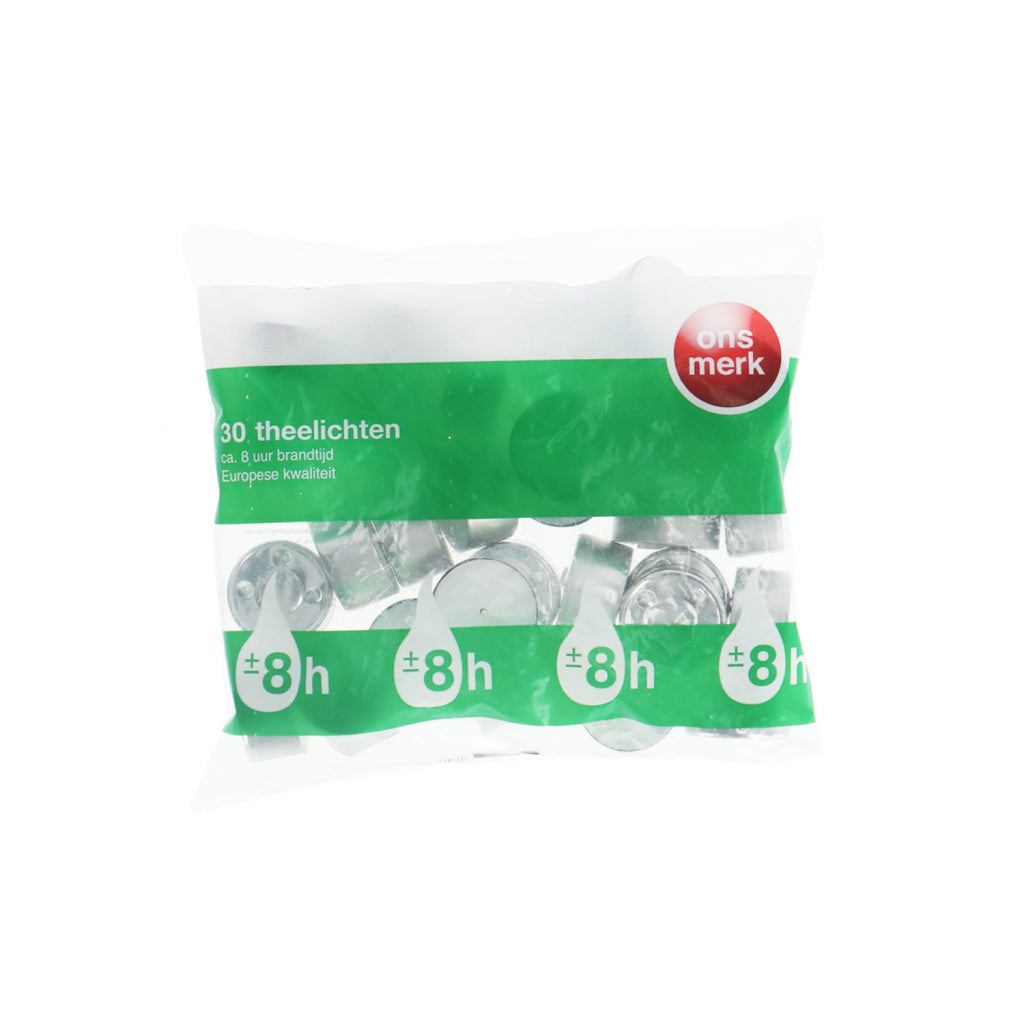 30 theelichtjes in cup van Ons Merk. Ze branden ca. 8 uren lang per lichtje zonder walmen en roetvorming.