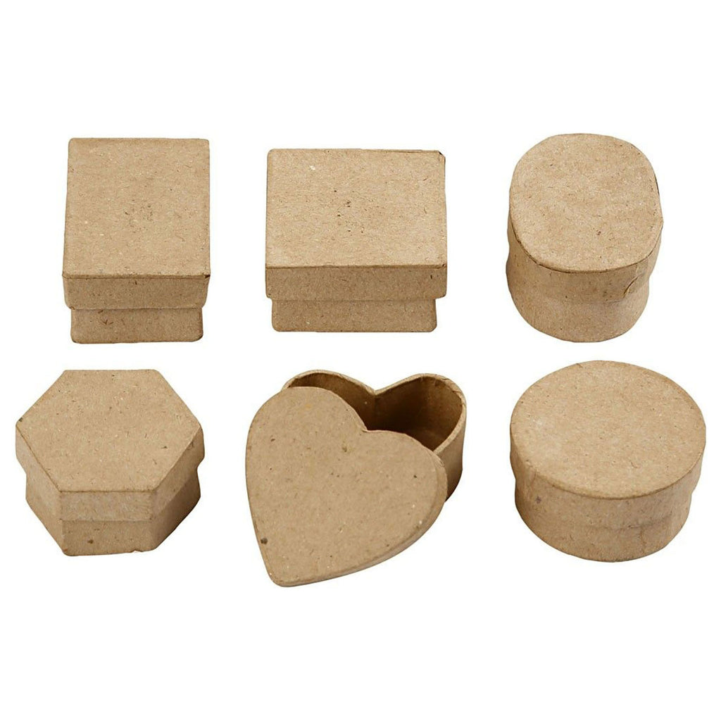 Set van 6 opbergdoosjes in verschillende vormen, gemaakt van papier-maché. De doosjes zijn heel geschikt om nog zelf te versieren met bijvoorbeeld verf, glitterlijm of stiften. De doosjes hebben een afmeting van 4 - 6 cm en zijn 3 cm hoog.