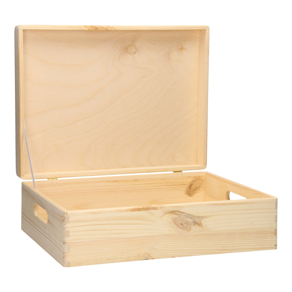 Rechthoekige opbergkist van grenen hout met klepdeksel. De klepdeksel blijft na openen rechtop staan dankzij het lint. Kleur scharnieren: goud. Twee handvat uitsparingen aan de zijkant. Versier naar eigen wens.