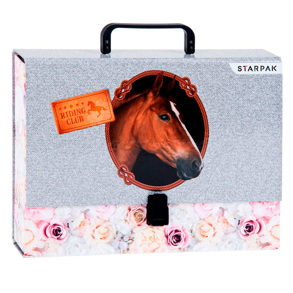 Bewaar als het schoolwerk of tekening in deze kartonnen opbergkoffer met een paardenprint. De koffer heeft een stevig handvat en een kliksluiting. Geschikt voor A4 papier.