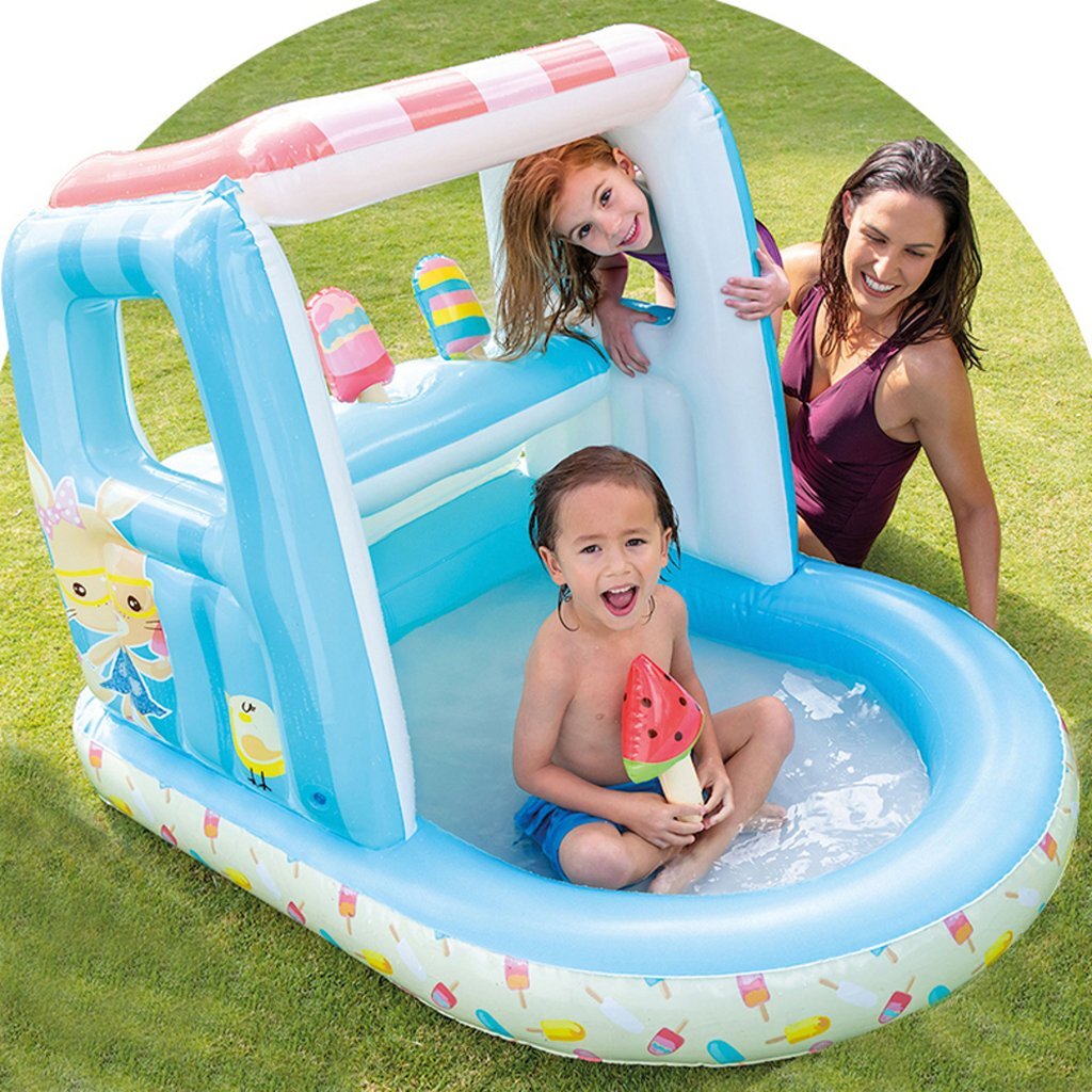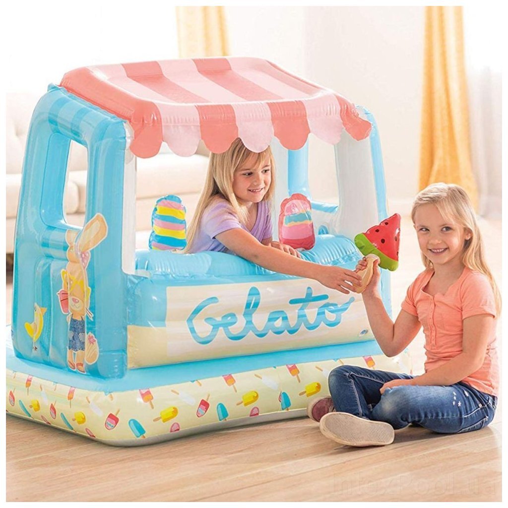Opblaasbaar speelhuisje in de vorm van een ijskraam, inclusief drie opblaasbare ijsjes. Het speelhuisje kan zowel binnen als buiten gebruikt worden. De achterkant van het speelhuisje kan bovendien gevuld worden met water zodat het een klein zwembadje wordt.
