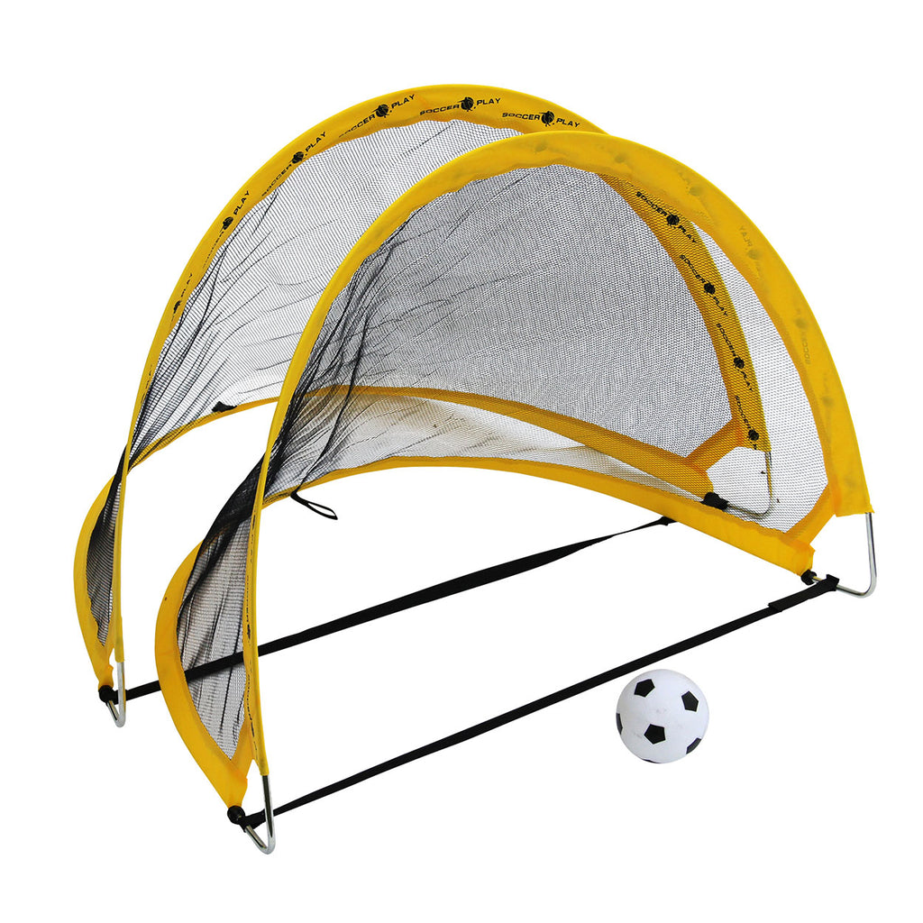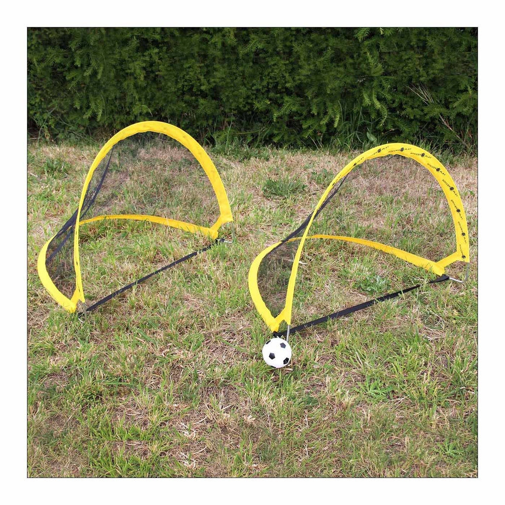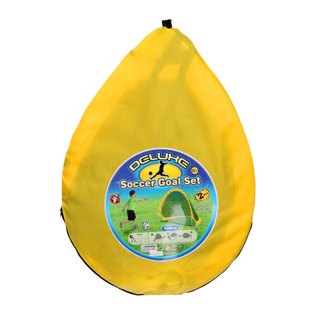 Set van 2 pop-up hockey- of voetbaldoeltjes. Inclusief voetbal, pompje en twee haken om de doeltjes vast aan de grond te zetten. Verpakt in een handige opbergtas.
