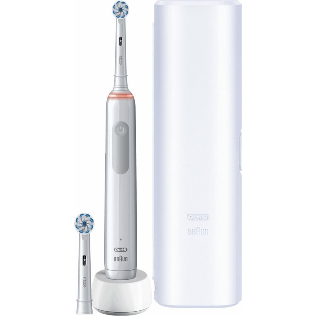 De vernieuwde PRO 3 3500 wordt geleverd met een Sensitive Clean opzetborstel. Deze opzetborstel is extra zacht, voor een aangename en effectieve reiniging. Gebruik hem in combinatie met de poetsstand voor gevoelige tanden voor het beste resultaat. De Oral-B PRO 3 elektrische tandenborstel heeft een krachtige motor met 40.000 pulsaties en 8.800 rotaties per minuut. De ingebouwde poetsdruksensor en timer zorgen tijdens het poetsen voor extra ondersteuning. De 360° poetsdrukcontrole waarschuwt je direct wanneer je te hard poetst. De rand licht rood op en de tandenborstel gaat automatisch zachter draaien. Op deze manier worden je tanden en tandvlees beschermd tegen beschadigingen. Ook te kort poetsen is haast niet meer mogelijk. Iedere 30 seconden vindt er een korte stottering plaats om aan te geven dat het tijd is om van zone in de mond te wisselen. Wanneer je alle 4 de zones in je mond gepoetst hebt vindt er een langere stop plaats. Op deze manier weet je dat je de poetsbeurt hebt volbracht en dat alle 4 de zones in de mond zijn gepoetst.