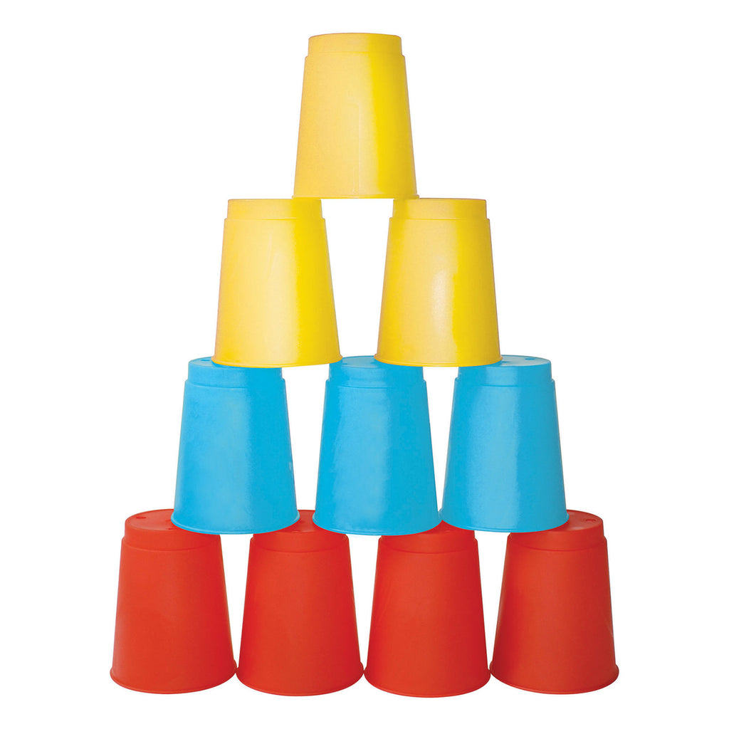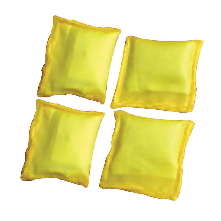 Inhoud: 4 kunststof lepels en eieren, 4 werpkussentjes (ook voor zakdoekje leggen) en 10 plastic blikjes.