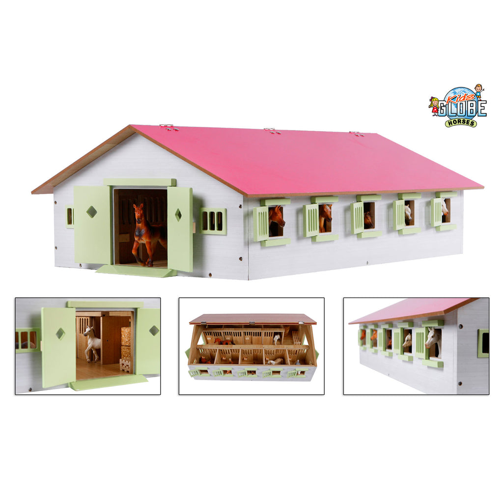 Deze paardenstal is gemaakt van hout en is gebouwd op een schaal van 1:32. De stal is voorzien van een roze dak en biedt plaats aan 9 paarden in de paardenboxen. De stal dient zelf gemonteerd te worden en komt exclusief paarden. De schleich paarden passen niet in deze stal.