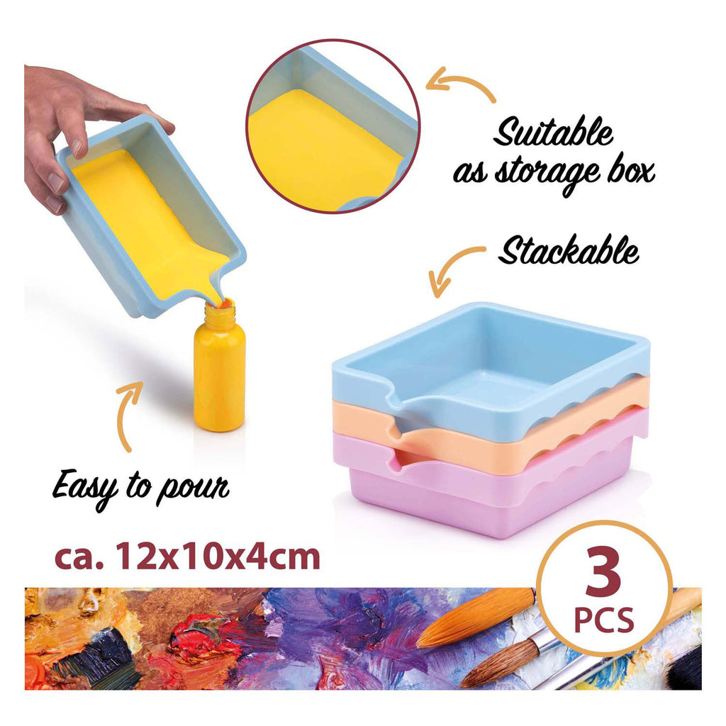Set van drie kleurrijke palet mengbakjes, ideaal voor verf en creatieve projecten. Stapelbaar ontwerp voor eenvoudige opslag.