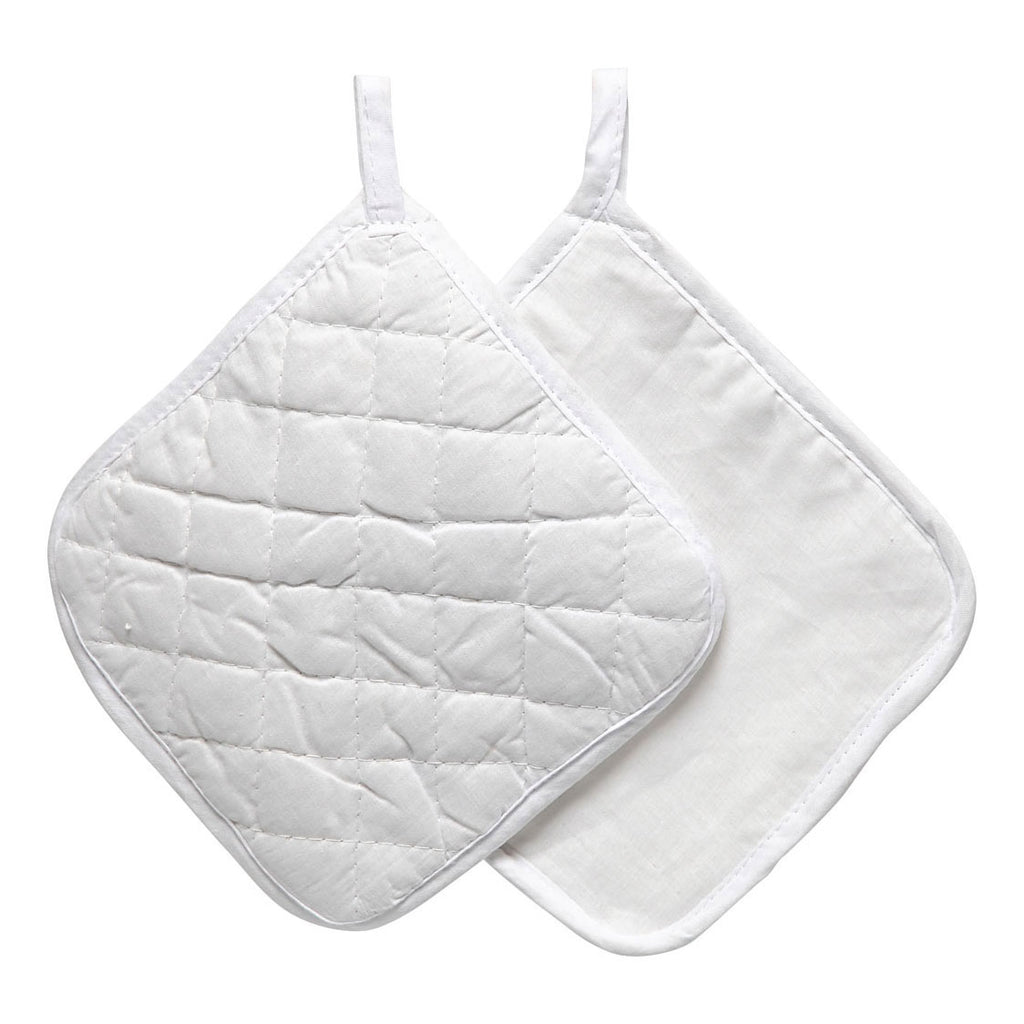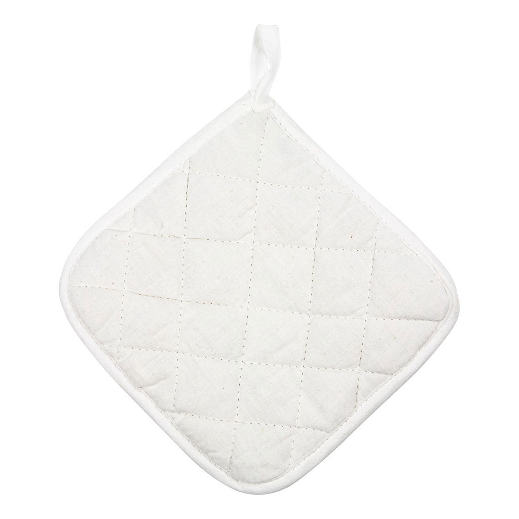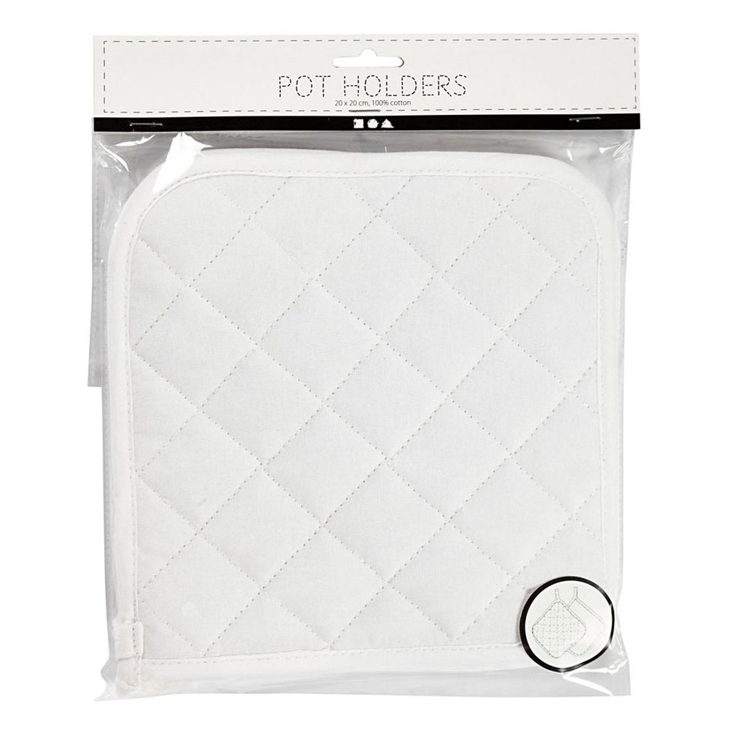 Vierkante, gewatteerde pannenlappen van 100% katoen met ophanglus. Aan één zijde doogestikt.