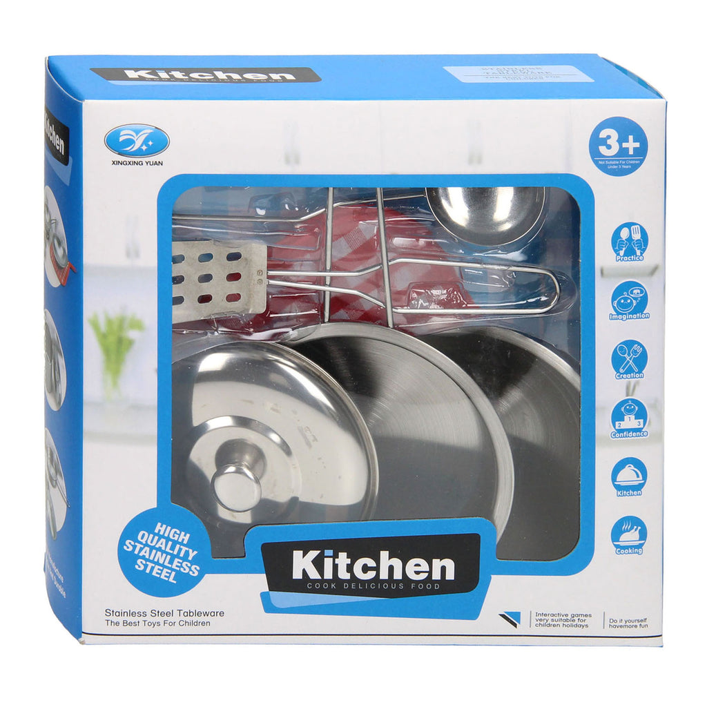 Deze 6delige pannenset bestaat uit 2 metalen schalen, een deksel, 2 opscheplepels en een katoenen pannenlap. Een mooie uitbreiding voor je speelgoedkeuken, de 6delige Pannenset!