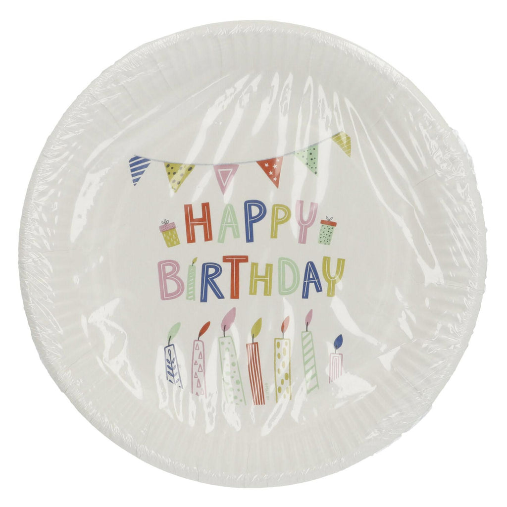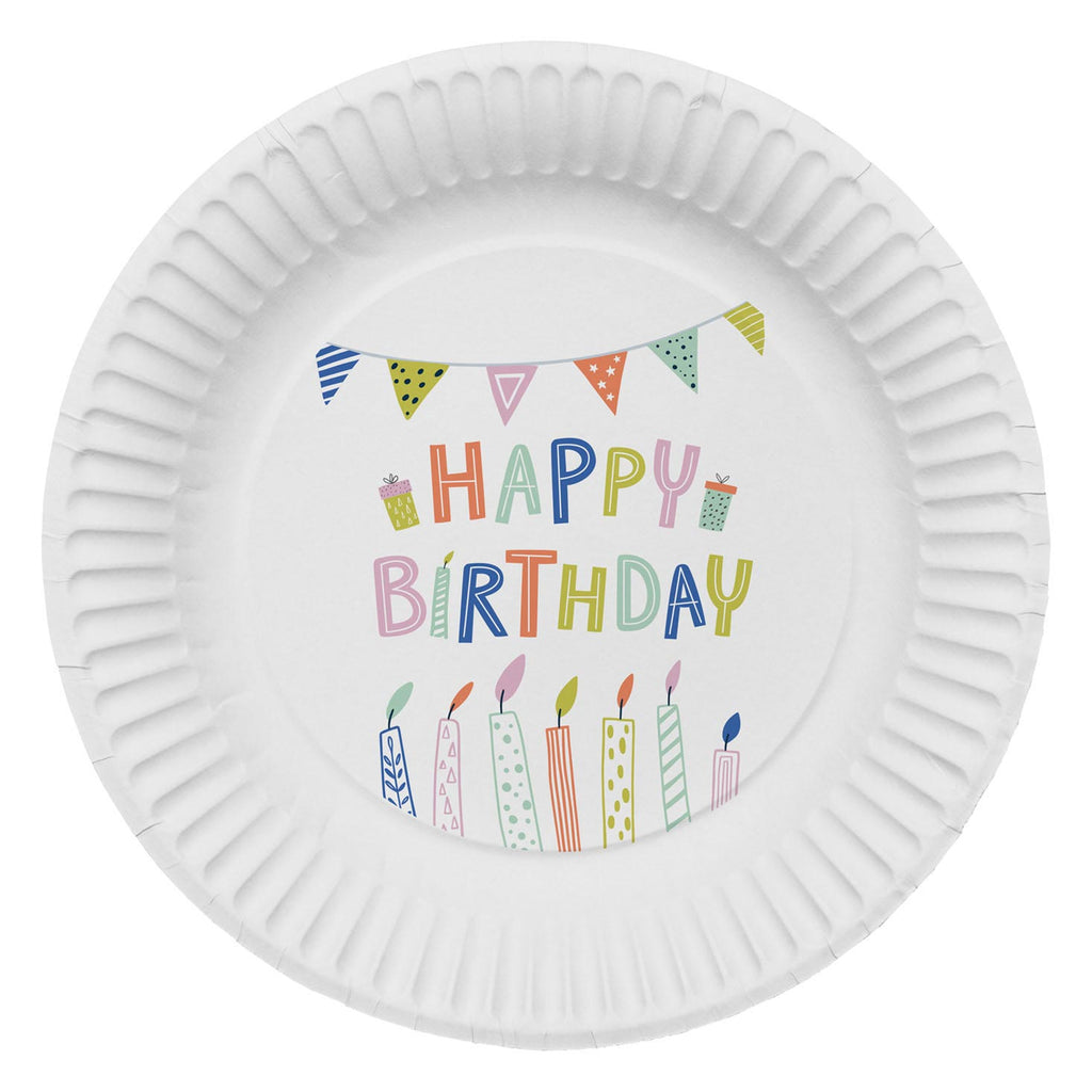 Deze vrolijke papieren verjaardagsbordjes uit de Eco Party-lijn zijn superleuk voor verjaardagen en kinderfeestjes! De set bevat 8 wegwerpborden van 23 centimeter groot, gemaakt van FSC®-gecertificeerd papier. De papieren feestbordjes zijn enkelzijdig bedrukt met de tekst ‘Happy Birthday’, een vrolijke vlaggenlijn en kaarsjes.