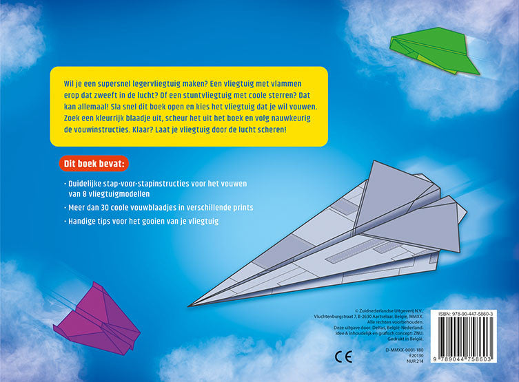 Wil je een supersnel legervliegtuig maken? Een vliegtuig met vlammen erop dat zweeft in de lucht? Of een stuntvliegtuig met coole sterren? Dat kan allemaal! Sla snel dit boek open en kies het vliegtuig dat je wil vouwen. Zoek een kleurrijk blaadje uit, scheur het uit het boek en volg nauwkeurig de vouwinstructies. Klaar? Laat je vliegtuig door de lucht scheren! Dit boek bevat: o Duidelijke stap-voor-stapinstructies voor het vouwen van 8 vliegtuigmodellen o Meer dan 30 coole vouwblaadjes in verschillende prints o Handige tips voor het gooien van je vliegtuig Met uitscheurbare vouwblaadjes!