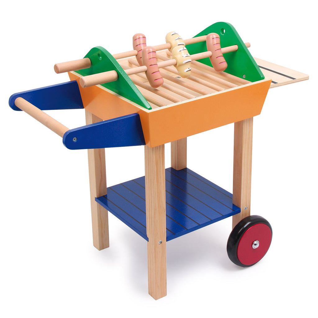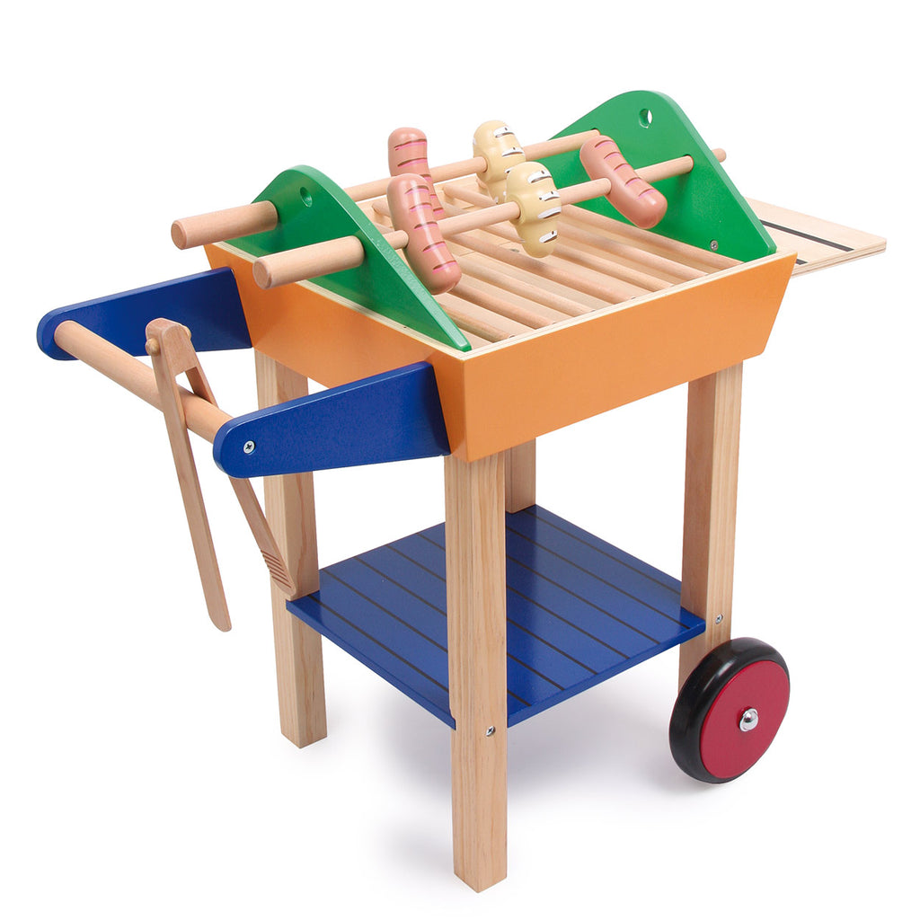 Deze houten kar belooft heerlijk barbecuen in een kinderkamer. De kar is gemaakt van stevig multiplex. De wielen zijn met rubber bekleed om een soepele loop te garanderen. 7 houten staven vormen het rooster, 2 roterende staven dienen als spies. 5 expliciet beschilderde houten worsten en een BBQ-tong maken het realistische ontwerp compleet! De uitklapbare plankruimte met stabiele vergrendeling en het onderste opbergvak bieden extra speelruimte voor speelgoedwinkelaccessoires en keukengerei.