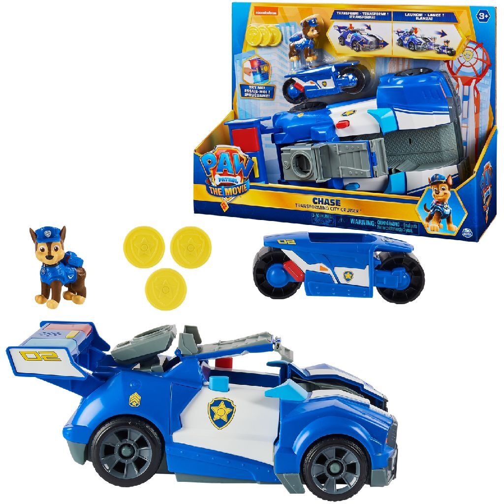 Deze 2-in-1 politieauto en motorfiets brengen de actie en spanning van PAW Patrol De Film tot leven. De auto heeft authentieke filmdetails en graphics, een projectielwerper, knipperende lichtjes en realistische geluiden. Als Avonturenstad in de problemen zit, plaats je Chase achter het stuur van zijn auto en race je naar de noodsituatie. Zodra je de locatie hebt bereikt, druk je op de gele knop om de lichten en geluiden te activeren. Bescherm Chase tegen vallend puin door over te schakelen naar de pantsermodus. Plaats de schijven (drie meegeleverd) en druk op de knop om ze te lanceren. Heb je tijdens je missie behoefte aan een wat compacter voertuig? Lanceer dan de motorfiets. Druk op de rode knop om het binnenvak van het voertuig te openen en druk nogmaals om Chase en zijn motor te lanceren. Om alles te resetten, plaats je de motor terug in de auto en duw je de wielen tegen elkaar. Wordt inclusief 3 knoopcelbatterijen geleverd. Geschikt voor kinderen vanaf 3 jaar.