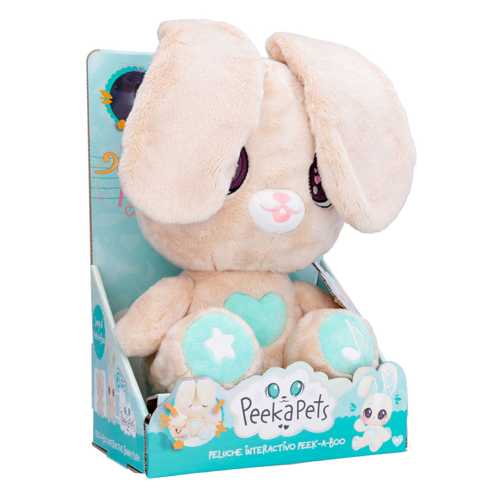 Speel kiekeboe met de schattige, zachte en knuffelige PeekaPets Bunny! Kleintjes zullen vrolijk lachen als ze de oren van het Konijntje heen en weer zien gaan. Knijp in de linkervoet en de oren springen omhoog: kiekeboe!! Ze maakt leuke geluidjes en haar hartje zal oplichen. En als het tijd is om naar bed te gaan, dan zet je je PeekaPets Bunny in nachtstand. Druk in de rechtervoet en ook je PeekaPet zal gaan slapen. Het hartje zal oplichten terwijl een zacht slaapliedje hoorbaar is, slaap lekker! PeekaPet Bunny heeft een vrolijke gezichtje, waar je meteen verliefd op wordt. Je PeekaPet is licht van kleur met mintgroene details. Zintuiglijk spelen met speelgoed bevordert de ontwikkeling van jonge kinderen. Speel met je PeekaPet en neem hem mee naar bed om heerlijk mee in slaap te vallen!