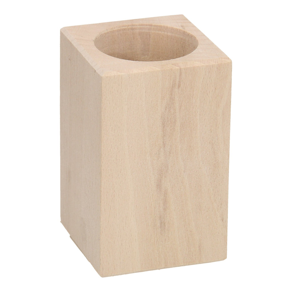 Vierkant pennenbakje van beukenhout met ronde opening. De doorsnede van de opening is 4,5 centimeter. Versier het pennenbakje naar eigen wens.