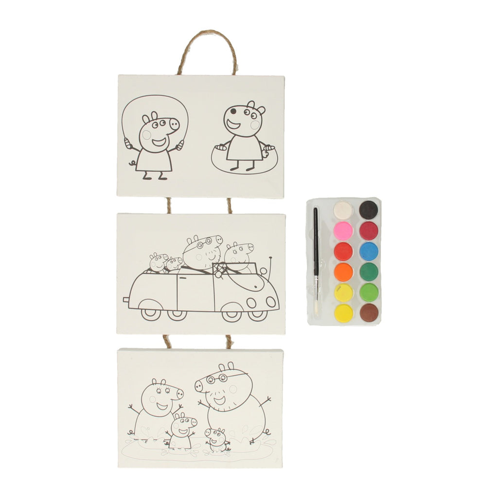 Schilder de Peppa Pig canvas in en hang je creatie op een mooi plekje! De set van 3 schilderdoekjes zijnaan elkaar bevestigd met touw en kunnen als 1 kunstwerkje opgehangen worden. De set bevat een schilderkwastje en verf zodat je alles bij de hand hebt! Geschikt voor kinderen vanaf 3 jaar.