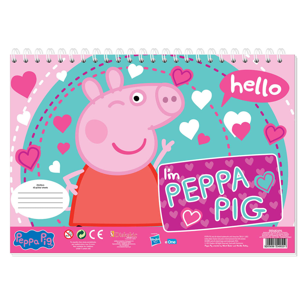 Schilder of kleur deze tekeningen van Peppa Big en haar vrienden. Plak de verschillende stickers op de tekeningen. Aan de buitenkant van het schetsblok zit een liniaal van 30 centimeter lang, en uitsparingen in verschillende vormen, zoals een hartje, boom en vierkant, die je na kunt trekken met een stift of potlood. Het schetsboek is 33 bij 23 centimeter. Inclusief stickers en liniaal. Geschikt voor kinderen van 3 tot 6 jaar oud.