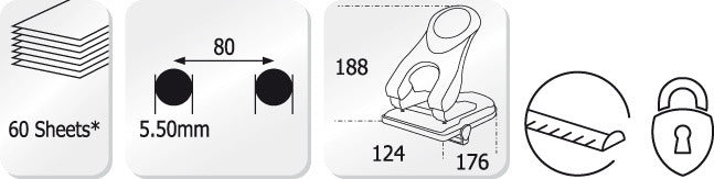 Zware kantoorperforator voor maximaal 60 velllen. Met een metalen aanleg. Handige bovendeel-vergrendeling voor ruimtebesparend opbergen. Metalen apparaat. Verwijderbare opvangbak. Passend bij nietmachines 'Trendy'.