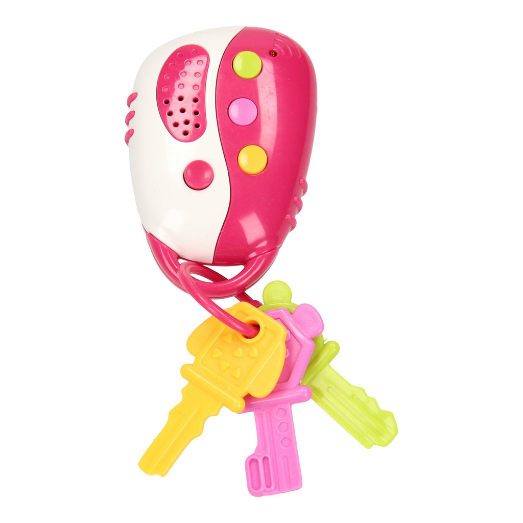 Deze roze sleutelbos heeft drie pastelkleurige sleutels die geluid maken als de peuter ermee rammelt. De sleutelbos maakt ook geluid wanneer je op één van de vier knopjes drukt. Ieder knopje maakt een ander geluid: een deur die geopend wordt, een claxon, een startende motor of een melodie. De kleuren, vormen, het gerammel en de geluidjes prikkelen op een speelse manier de zintuigen. De sleutelbos is gemaakt van kunststof. Geschikt vanaf 12 maanden. Werkt op 2 AAA batterijen (inbegrepen).
