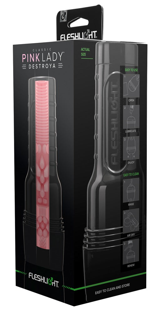 Handige Pink Lady Destroya masturbator van Fleshlight in een discreet zwart fakkelontwerp met een realistische vaginaopening. De divers gestructureerde binnenkant met verschillende diameters zorgt voor een intense, orgastische massage tijdens een handjob. De roze binnenhoes van huidachtig, superzacht materiaal kan gemakkelijk van de masturbator worden verwijderd om schoon te maken.