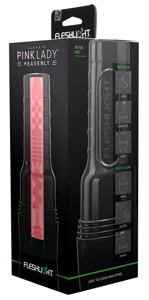 The non-slip Pink Lady Heavenly masturbator from Fleshlight is in a discreet, black torch design and it has a realistic vagina hole. The various textures and the different diameters inside are perfect for an intense, orgasmic massage during a hand job. The pink sleeve is made out of extremely soft, skin-like material and it can be easily removed for cleaning.