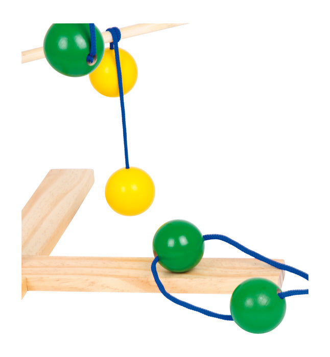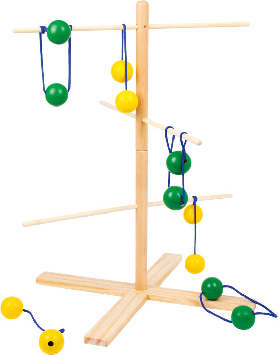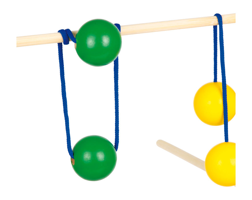 Fantastisch behendigheidsspel voor de training van de hand-oog coördinatie. 2 kleurig gelakte houten ballen (diameter ca. 4 cm) zijn aan een lint (L: ca. 23 cm) bevestigd en moeten zo gegooid worden dat ze om de stok van de houten standaard winden (gele ballen) of er juist overheen vallen (groene ballen). Iedereen moet zijn schietvaardigheid bewijzen. Snelle montage van de standaard door houten schroeven en insteekbare batons!
