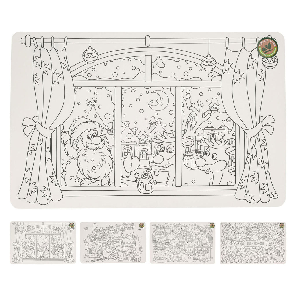 Set van 12 kerstplacemats om zelf in te kleuren. Gemaakt van 95% gerecyclede materialen en 100% recyclebaar. Vier verschillende prints.