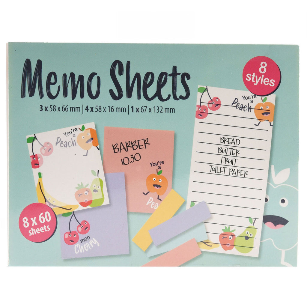 Set met verschillende plakkende memonotities met schattige fruitprints. Met 8 keer 60 memoblaadjes (3 varianten 58x66mm, 4 varianten 58x16 mm, 1 variant 67x132 mm).