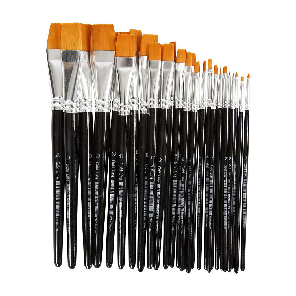 Set van 30 excellente platte all-round penselen met synthetisch nylon haar en korte houten steel. Geschikt voor zowel dunne als dikkere verven. Set bevat 7 verschillende maten. Maat penselen: 0, 2, 4, 8, 12, 16, 20. Breedte: 2-24 mm.