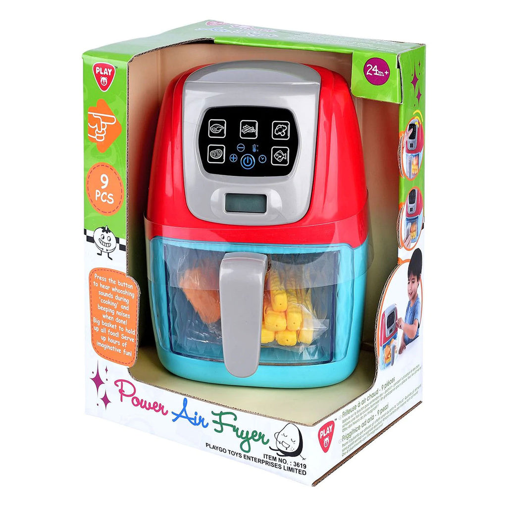Speelgoed airfryer van Play met realistische geluiden en een echt werkende timer. Stop je eten in de pan, druk op het juiste knopje en wachten maar. De airfyer is geschikt voor kinderen vanaf 2 jaar en werkt op 3 meegeleverde AAA-batterijen. Gemaakt van rood/grijs/blauw kunststof.