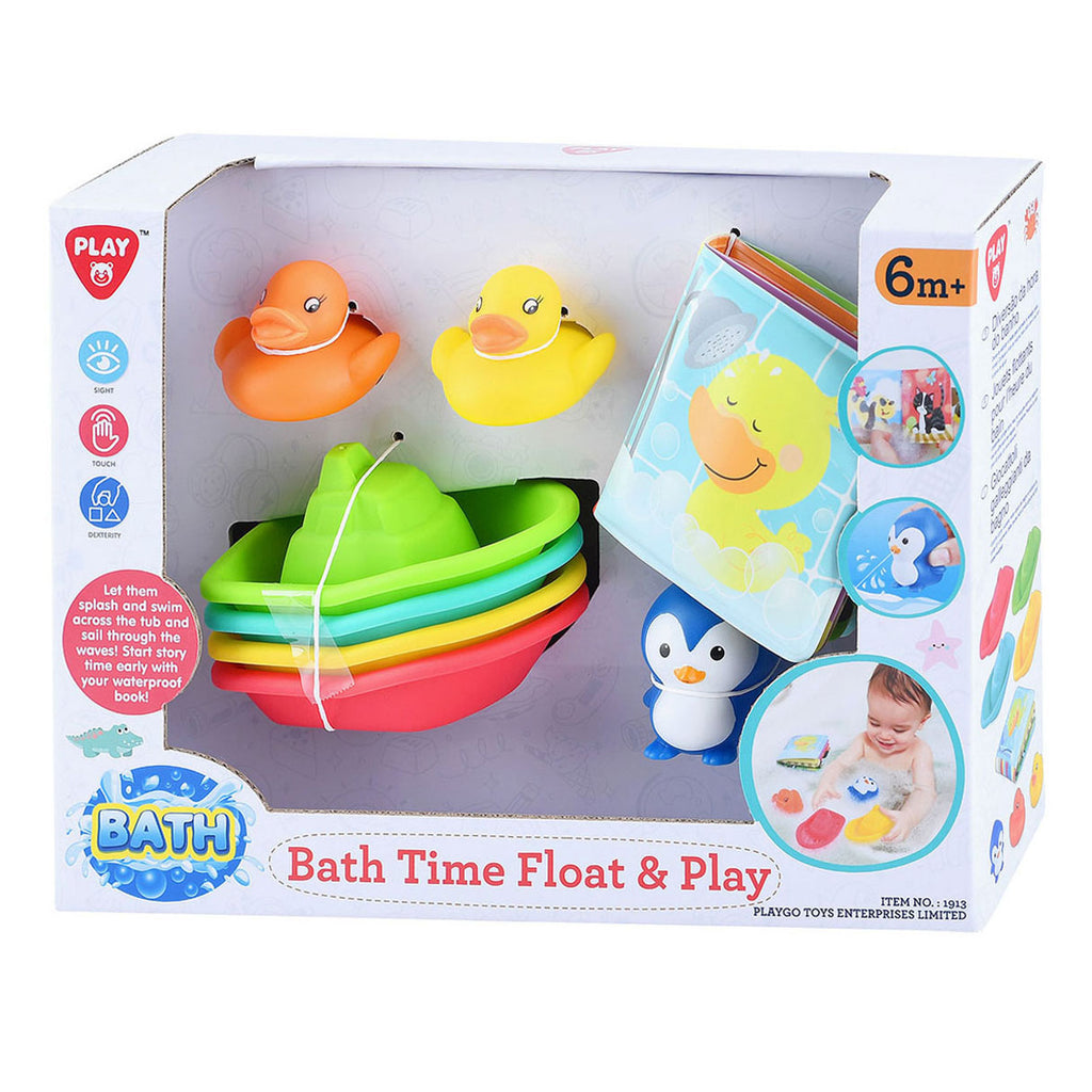 Set van 8 badspeeltjes voor kinderen van 6 maanden en ouder: 4 badbootjes, een badboekje, 2 eendjes en een waterspuitende pinguïn.