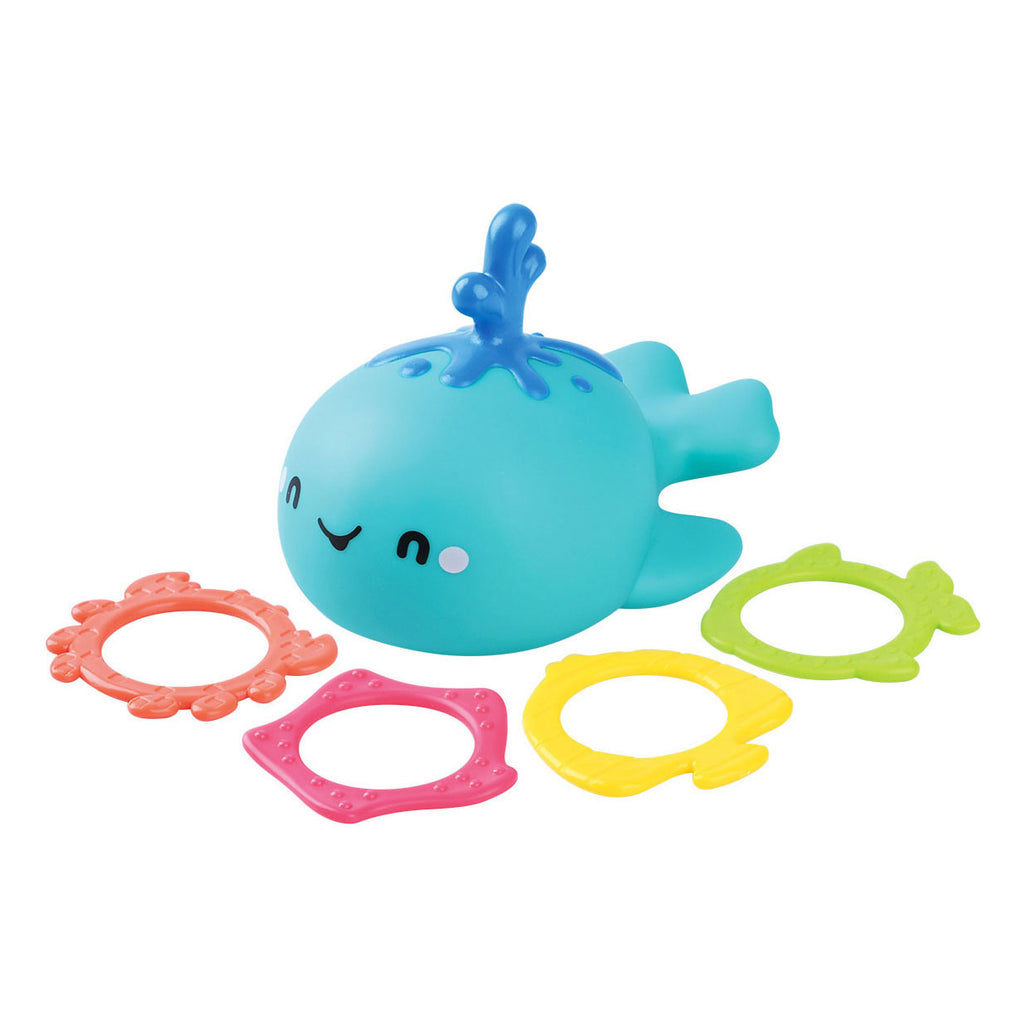 Bath Whale Ring Toss - Interactief plezier met water of zonder! Lachende walvis met 4 verschillende kleur- en vorm ringen. Erg leuk voor kinderen tijdens het badderen. Deel een leuk bad met je nieuwe dierenvriend! Kijk hoe het rond het bad stroomt. Geweldig badspeelgoed om het zicht, de aanraking en de behendigheid van kinderen te stimuleren. Perfect badspeelgoed voor peuters, baby's, jongens en meisjes. Kinderen spelen graag met dit schattige badspeelgoed. Spetterende badringsprei, urenlang fantasierijk spetterend plezier! Geniet van het leuke moment van baden en kijken naar de walvis die ronddobbert tijdens het baden! Geweldig speelgoed om het zelfvertrouwen en geduld van kinderen te versterken en de hand-oogcoördinatie te ontwikkelen.