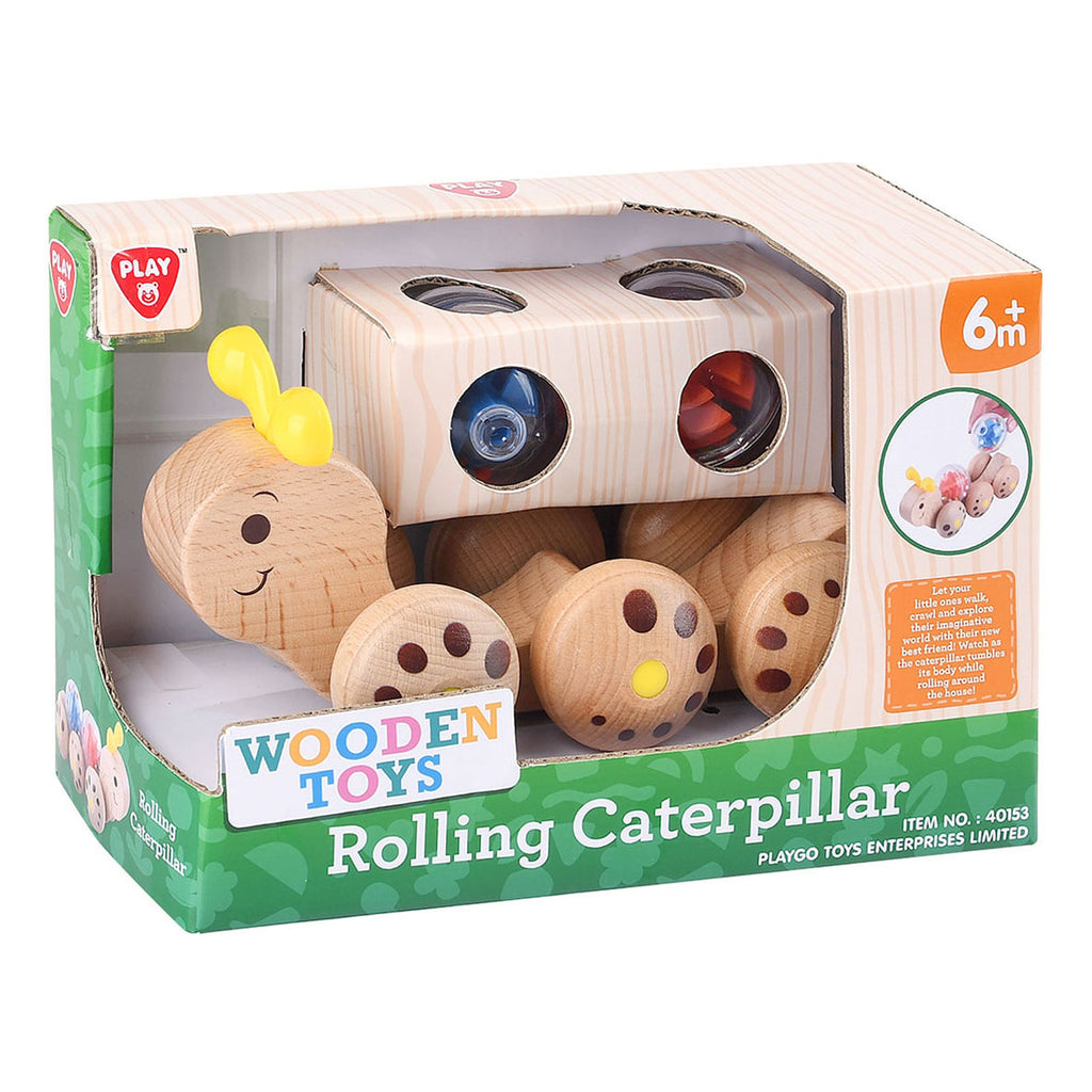 Houten rups met wieltjes en balletjes die geluid maken. Geschikt voor kinderen vanaf 6 maanden.