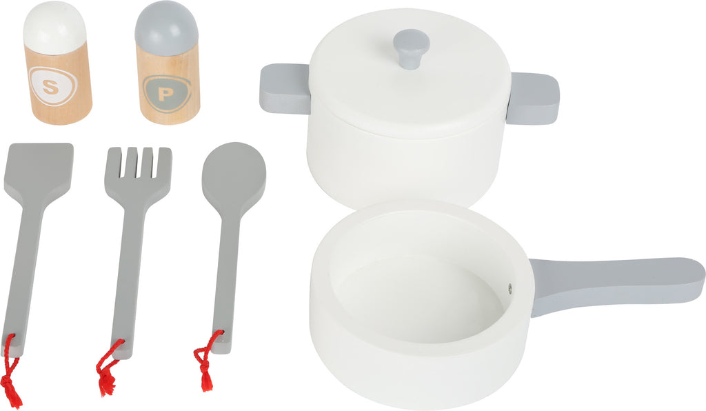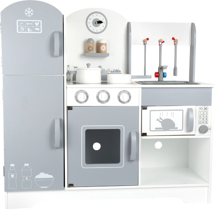 Alle topkoks opgelet! Met deze goed uitgeruste houten speelkeuken, compleet met koelkast, wordt elk kind vast en zeker een keukenster in de kinderkamer. Hier kan werkelijk elke wens in vervulling gaan! Geen wens zal onvervuld blijven met de talrijke accessoires zoals de klepperende knoppen, het peper- en zoutstel en de potten. De stabiele constructie en de slanke vormgeving maken dit product tot een echte highlight met een grote speelwaarde.