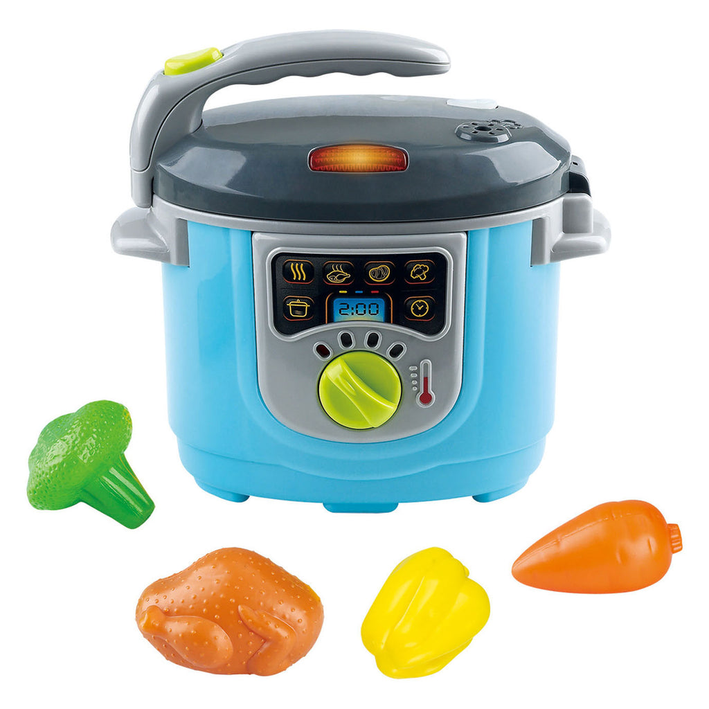 Speelgoed multicooker voor het bereiden van alle soorten speelgoedeten. De multicooker heeft lichtjes en maakt realistische kookgeluiden. Werkt op 3 meegeleverde AAA-batterijen en is geschikt voor kinderen vanaf 24 maanden. Gemaakt van blauw en grijs kunststof.
