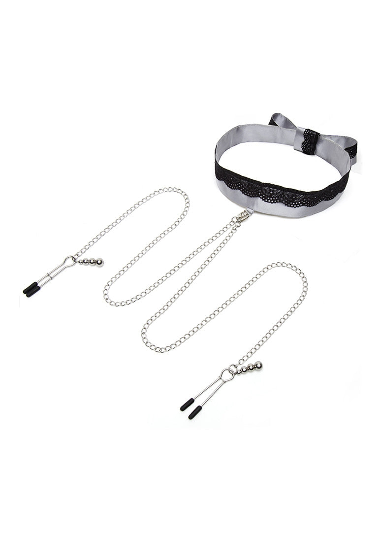 The elegant Sweet Play Nice Satin Collar & Nipple Clamps from Fifty Shades of Grey have nipple clams on chains. The silver-coloured satin collar is decorated with delicate black eyelash lace and it is 1.10 m long. The collar can also be tied to fit. The chains with the nipple clamps can be removed from the collar because they have snap hooks. The pressure of the clamps can be adjusted with the movable rings.