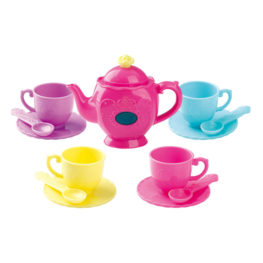 Theeset die geluid maakt als je begint te schenken en een muziekje afspeelt als je op de knop drukt van de theepot. De set bestaat uit een pot, 4 kopjes, 4 schoteltjes en 4 lepeltjes. Geschikt voor kinderen vanaf 24 maanden. Batterijen zijn inbegrepen.