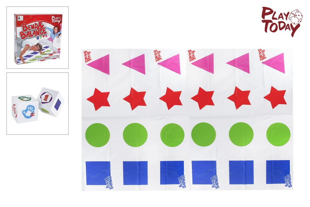 Gooi met de dobbelstenen: die bepalen of je je voet of hand op een bepaalde vorm/kleur moet zetten. Probeer niet te vallen! Geschikt voor 2 tot 6 spelers vanaf 6 jaar oud. Afmetingen: 160 x 120 centimeter.