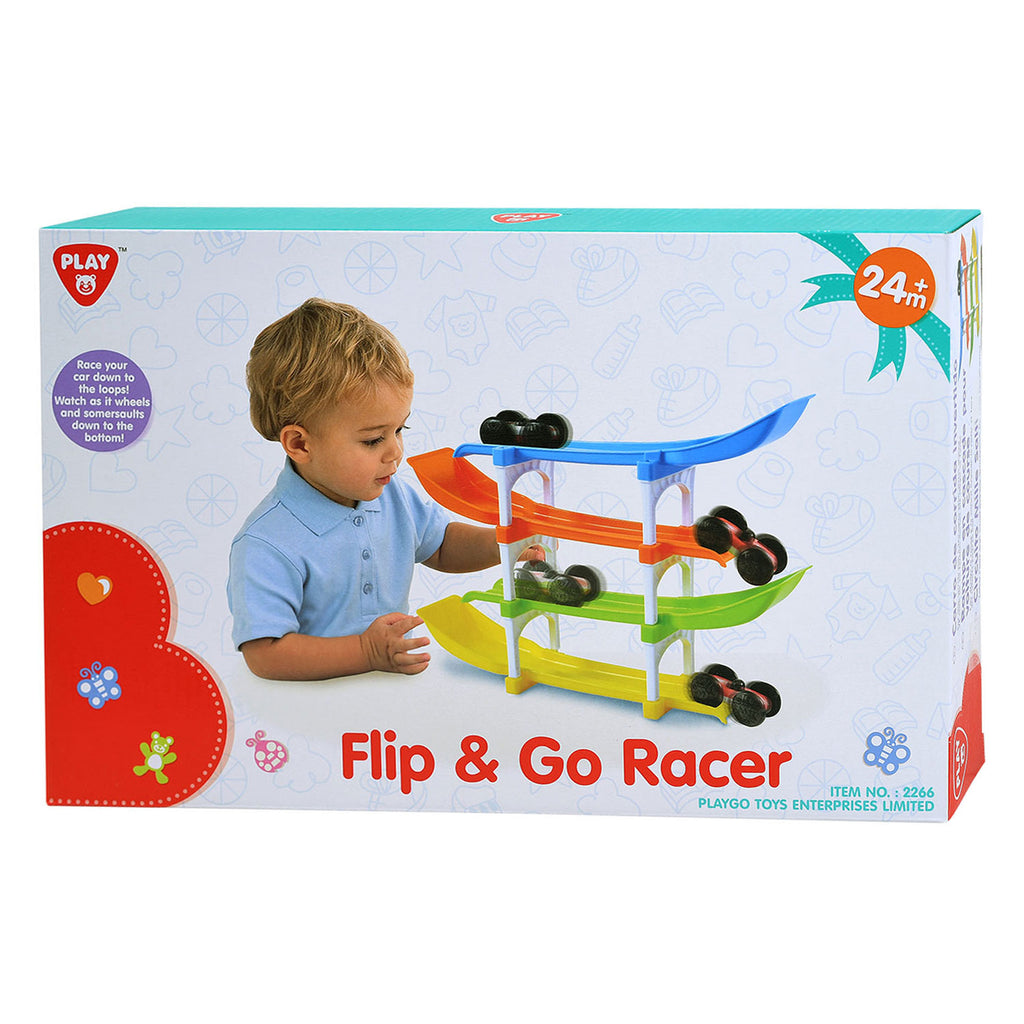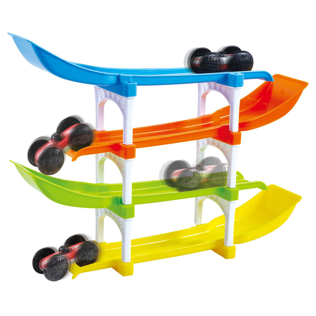 Met deze leuke autobaan inclusief flipauto's, zul jij je uren kunnen vermaken! De autobaan bestaat uit een weg op 4 verschillende plateaus. Zet de flipauto op de bovenste weg, en deze zal aan het eind van de weg een koprol maken en op de weg eronder belanden. Zo rijdt de auto helemaal naar beneden!