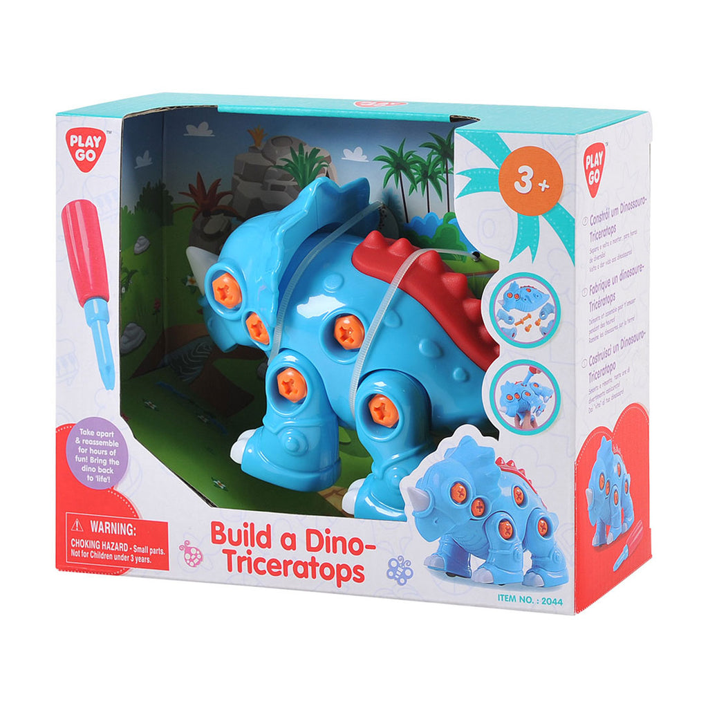 Maak je eigen Triceratops dino met deze bouw- en speelset van Play. Draai met de schroevendraaier de verschillende onderdelen van de dino uit elkaar en zet vervolgens de Triceratops opnieuw in elkaar. Met zijn beweegbare benen is de dinosaurus klaar voor avontuur! De vrolijk gekleurde onderdelen en grote schroeven zijn perfect voor kinderhanden. De set is gemaakt van stevig kunststof en wordt geleverd inclusief schroevendraaier.