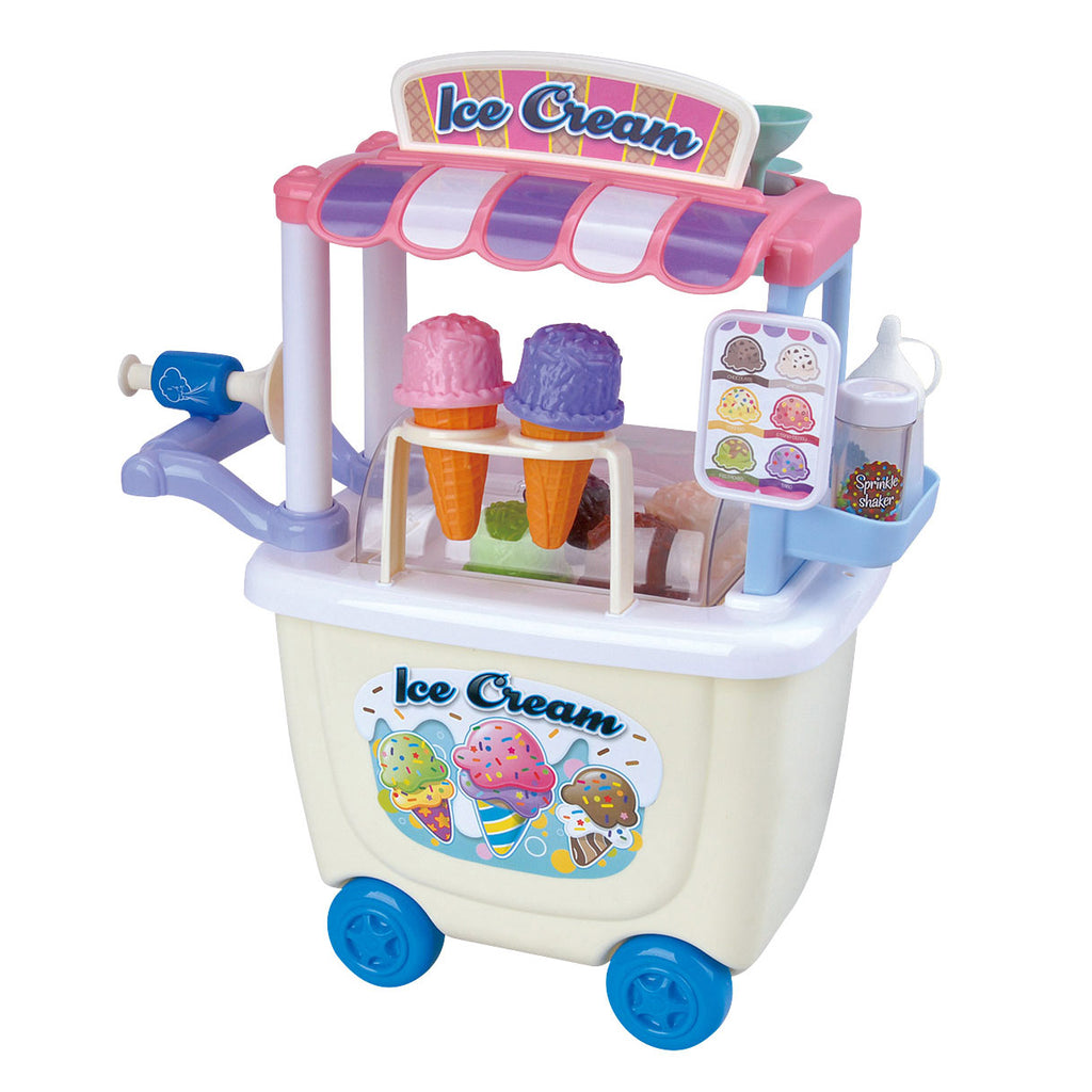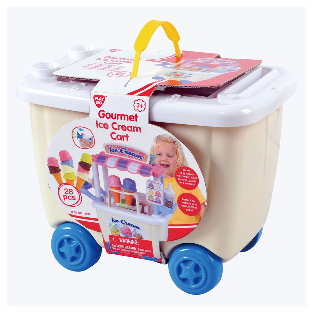Tuut-tuut! Ijsjes te koop! Begin je eigen ijskraam met deze speelset van Play. Duw de ijskar door het park en druk op de hoorn om te laten weten dat je er aan komt. Stal de 6 verschillende soorten ijs en de 2 toppings uit en laat de klanten kiezen. Met behulp van de ijsschep serveer je de bolletjes op het hoorntje of in een luxe coupe. Dankzij de luifel blijven je ijsjes lekker koel! De ijskraam, de ijsjes en de toppings zijn gemaakt van stevig kunststof in zomerse kleuren. Na het spelen ruim je de onderdelen gemakkelijk weer op in de handige opbergbox op wieltjes. De kleuren van het ijs kunnen afwijken van de getoonde afbeeldingen.