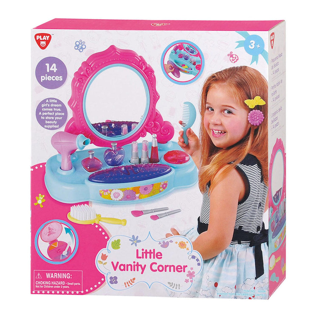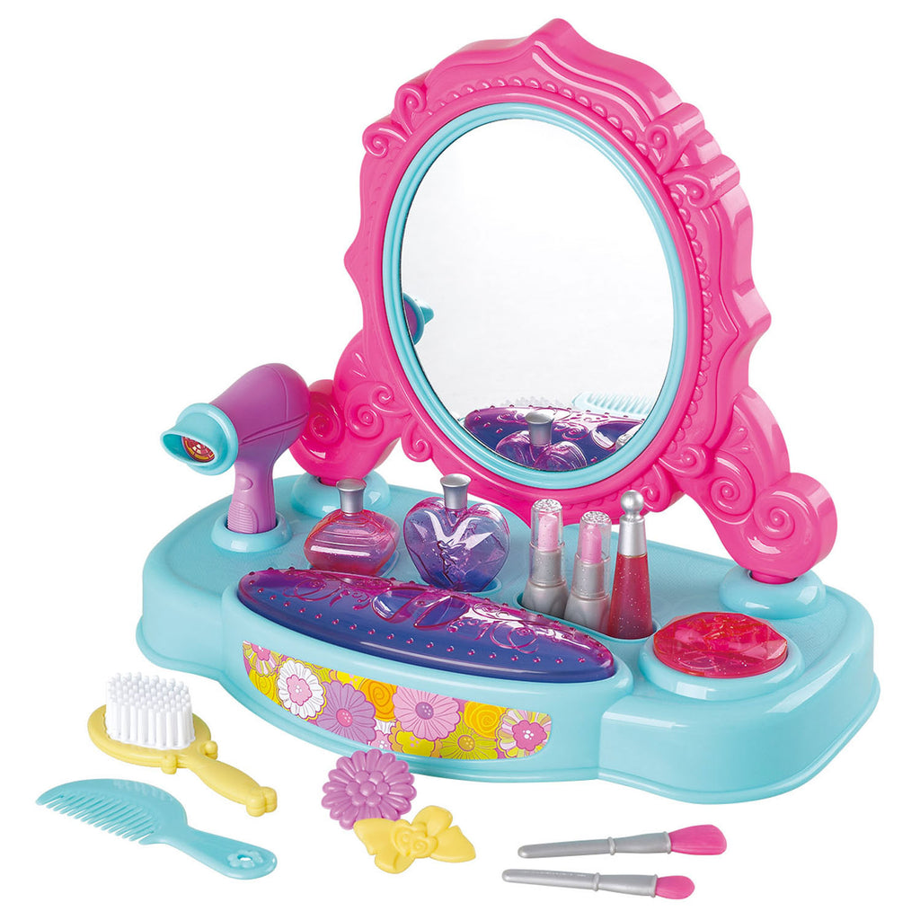 Deze Play Kaptafel is de droom van iedere kleine prinses. Geef jezelf een stijlvol kapsel of bescheiden laagje make-up. Haal de accessoires uit de lade en stal ze uit op het handige tafelblad. Borstel en kam je haren, föhn het droog en smeer er allerlei denkbeeldige oliën uit de flesjes in. Met de bijgeleverde clipjes maak je jouw prachtige kapsel compleet! De roze kaptafel is gemaakt van stevig kunststof.