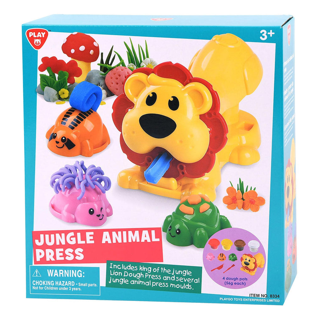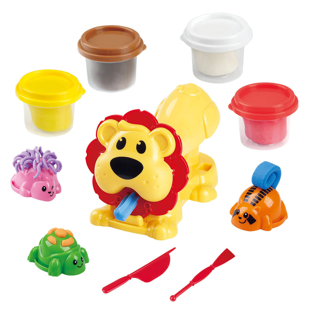 Play Kleiset Leeuw. In de kleiset zitten vier potjes gekleurde klei, drie jungledier persvormen, twee shaping tools en een kleimachine in de vorm van een leeuw.