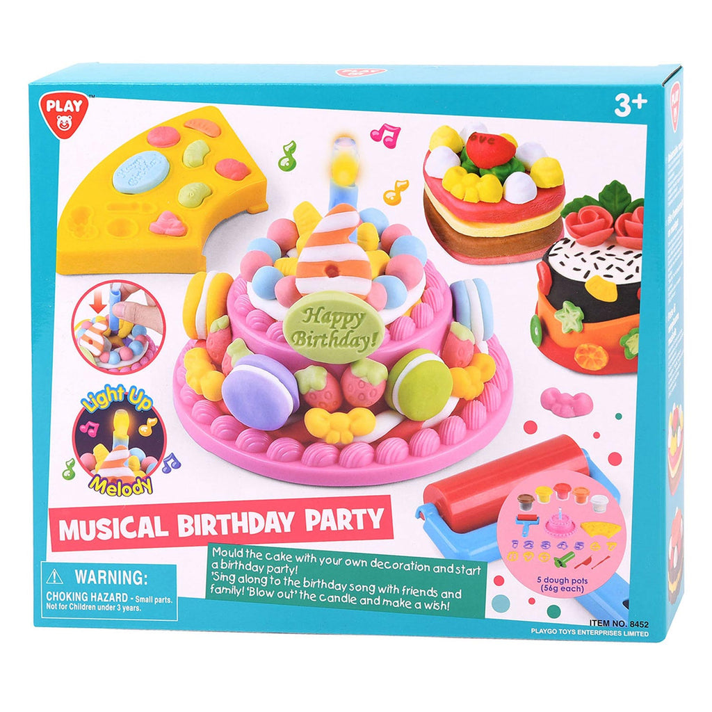 Play Kleiset Verjaardagstaart. In de kleiset zitten vijf verschillend gekleurde potjes klei, cijfer vormpjes van 0 tot 9, een deegroller, een spuit en twee shaping tools.
